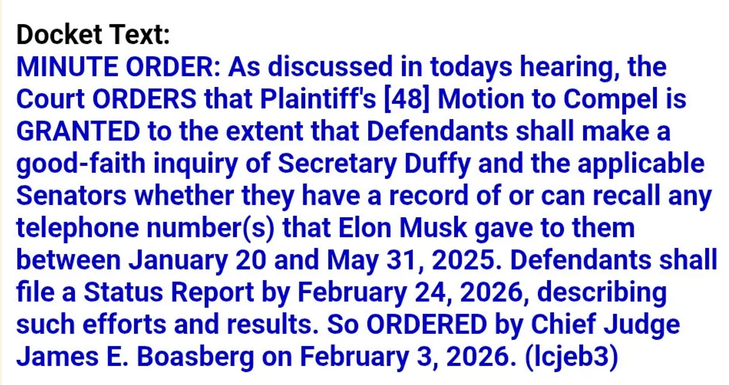 Though still refusing to acknowledge Musk was a government employee, DOJ argued they shouldn't have to find out if he was using a personal phone. They just lost that argument.