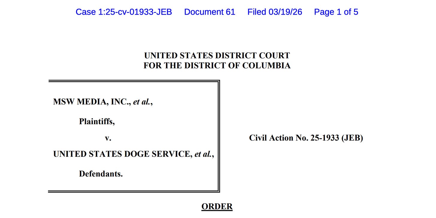 Tonight, MSW Media (me) and First Amendment Coalition got another favorable ruling in our Freedom of Information Act lawsuit against DOGE. Bottom line up front: the government talked itself into more work, and they still have to get Elon’s private phone number and preserve communications.