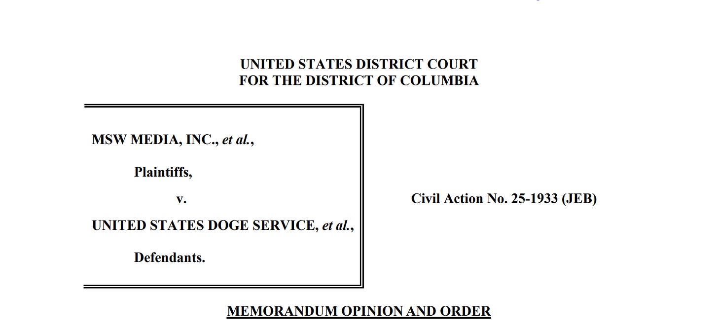 Earlier this year, the First Amendment Coalition (FAC) and my podcast media company MSW Media filed a joint Freedom of Information Act request for records related to DOGE. On March 10th, FAC propounded (added to) that request by moving the court to order DOGE to preserve communications related to the FOIA request on a phone number that Elon Musk gave to some Senators and Transportation Secretary Sean Duffy. That motion was just granted.